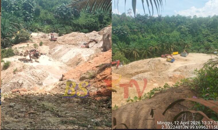 Berdasarkan investigasi lapangan oleh tim Jelajahperkara pada Minggu, 12 April 2026, ditemukan bukti nyata aktivitas pengerukan lahan secara terbuka. Berlokasi di koordinat 2.33224817N 99.69962115E, sejumlah alat berat terlihat bebas beroperasi melakukan penambangan yang diduga kuat tidak memiliki izin resmi.