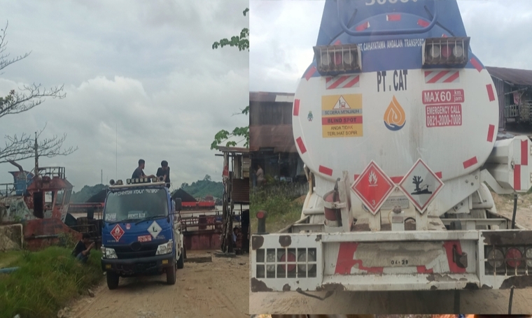 Berdasarkan hasil pemantauan di lokasi, terlihat sebuah proses pemindahan muatan BBM dari sebuah kapal LCT berwarna merah-putih ke sebuah unit mobil tangki berwarna biru-putih dengan kapasitas 5.000 liter. Pada lambung tangki kendaraan tersebut, tertera identitas “PT. CAHAYATAMA ANDALAN TRANSPORT”.